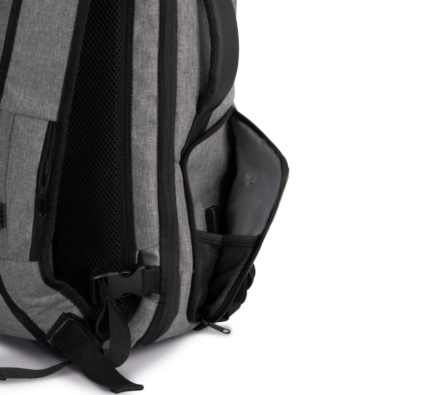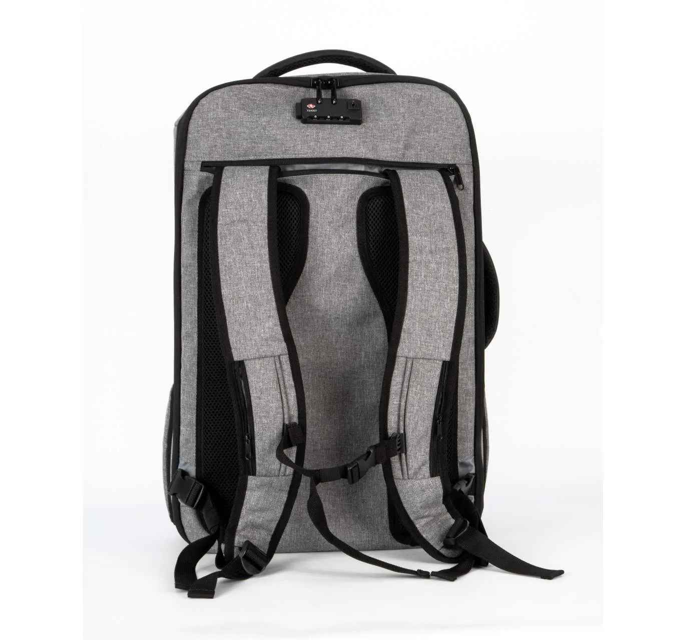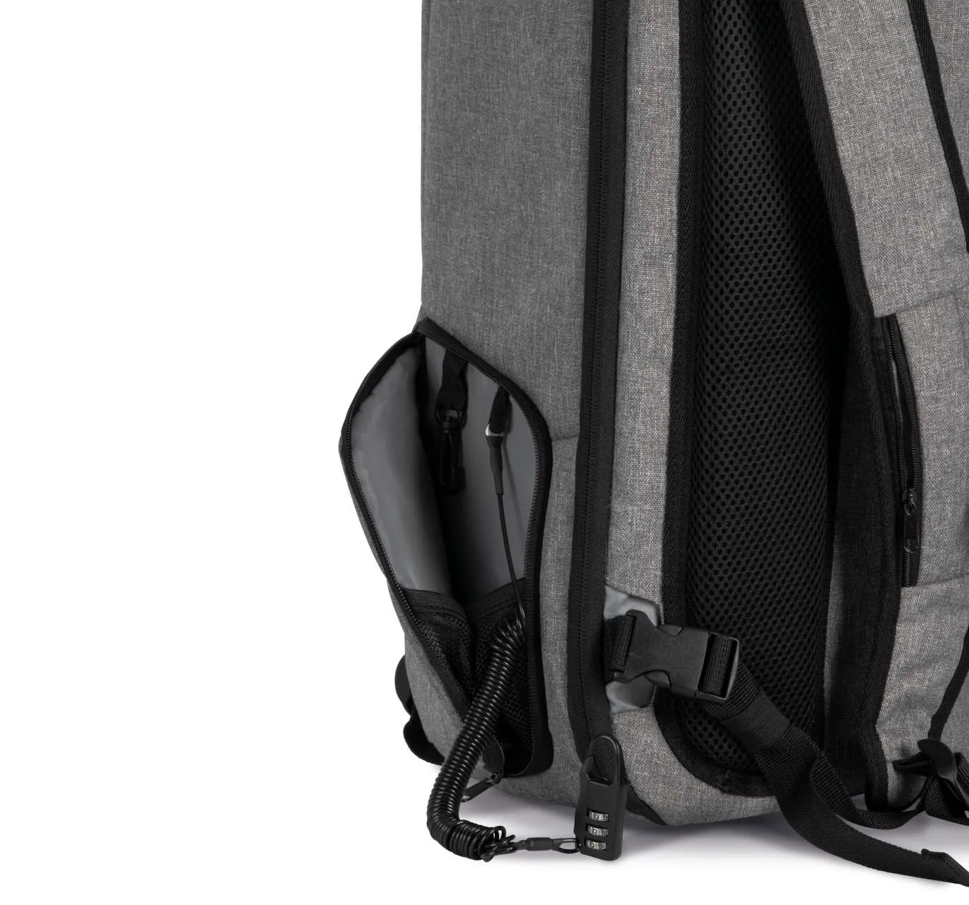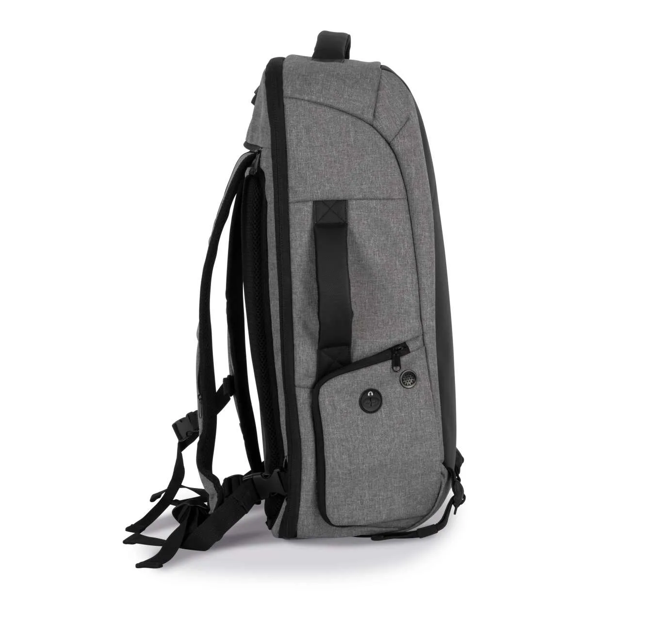 €55.87100 % poliester od čega 50 % reciklirani poliester kombinirani ruksak/putna torba za radnu odjeću KI0889 torba ima TSA patentni zatvarač s kombinacijom na stražnjem šavu za dodatnu sigurnost bočna džep s protuprovalnim kabelom za pričvršćivanje torbe za stol ili nogu stolice i unutarnji džep s RFID zaštitom protiv neovlaštenog skeniranja podataka s čip kartice ili kreditne kartice podstavljena leđa, podstavljene podesive naramenice i podesivi prsni remen za lakše nošenje, dvije trake ispod torbe za nošenje gornjih majica i jakni, dva bočna džepa, jedan bočni džep za punjenje s USB priključkom za povezivanje uređaja za punjenje i micro USB priključak (kabel uključen) na bočnoj strani torbe za povezivanje s powerbankom dvije džepove s patentnim zatvaračem na naramenicama i odvojivi podstavljeni remen za rame koji omogućuje pretvaranje ruksaka u putnu torbu glavni pretinac odvojen je od stražnjeg pretinca mrežom s patentnim zatvaračem za odlaganje odjeće stražnji pretinac za prijenosno računalo do 15'' i podstavljeni pretinac za tablet do 11'', mrežasti džep i dvije odvojive torbice s patentnim zatvaračem za kabele i dodatke
