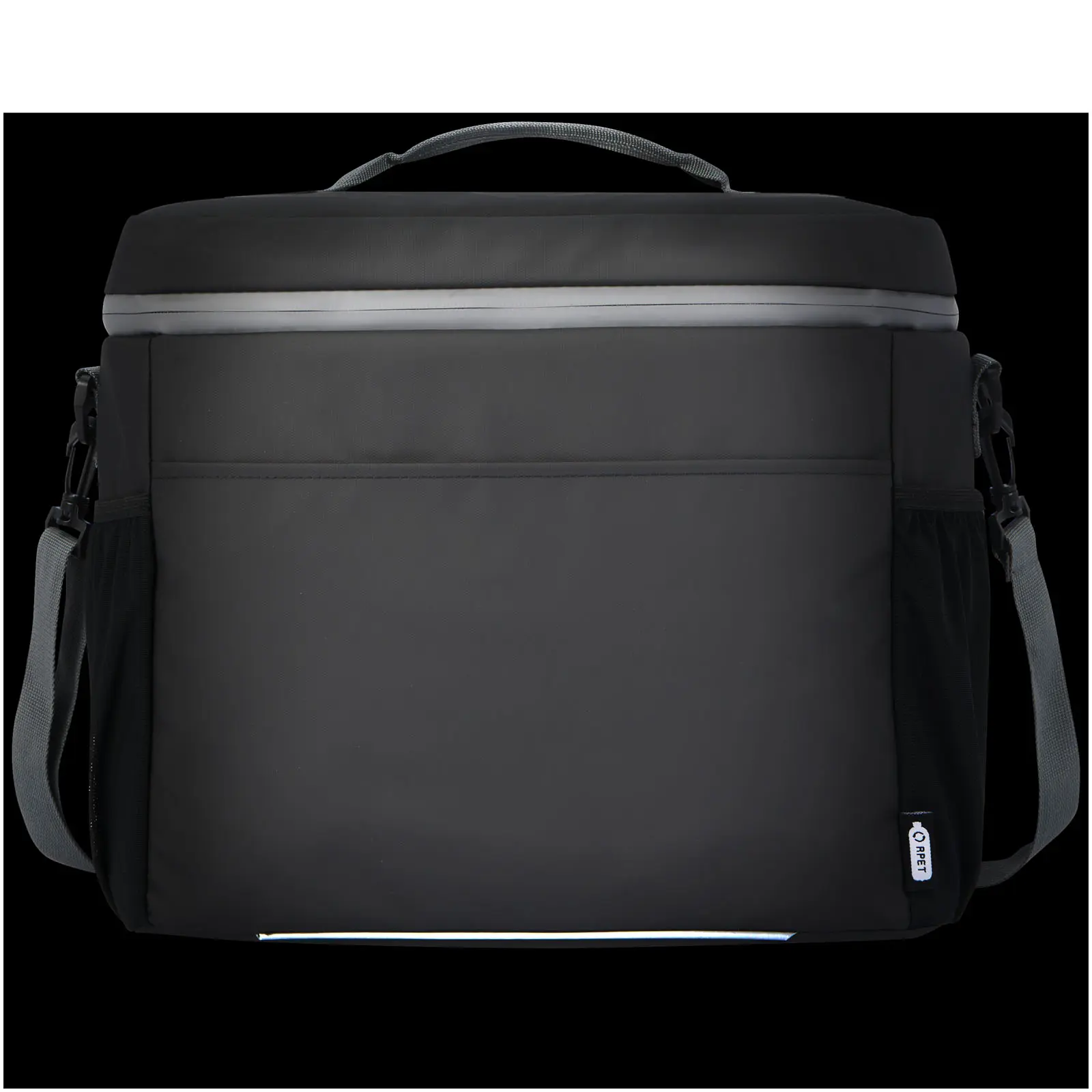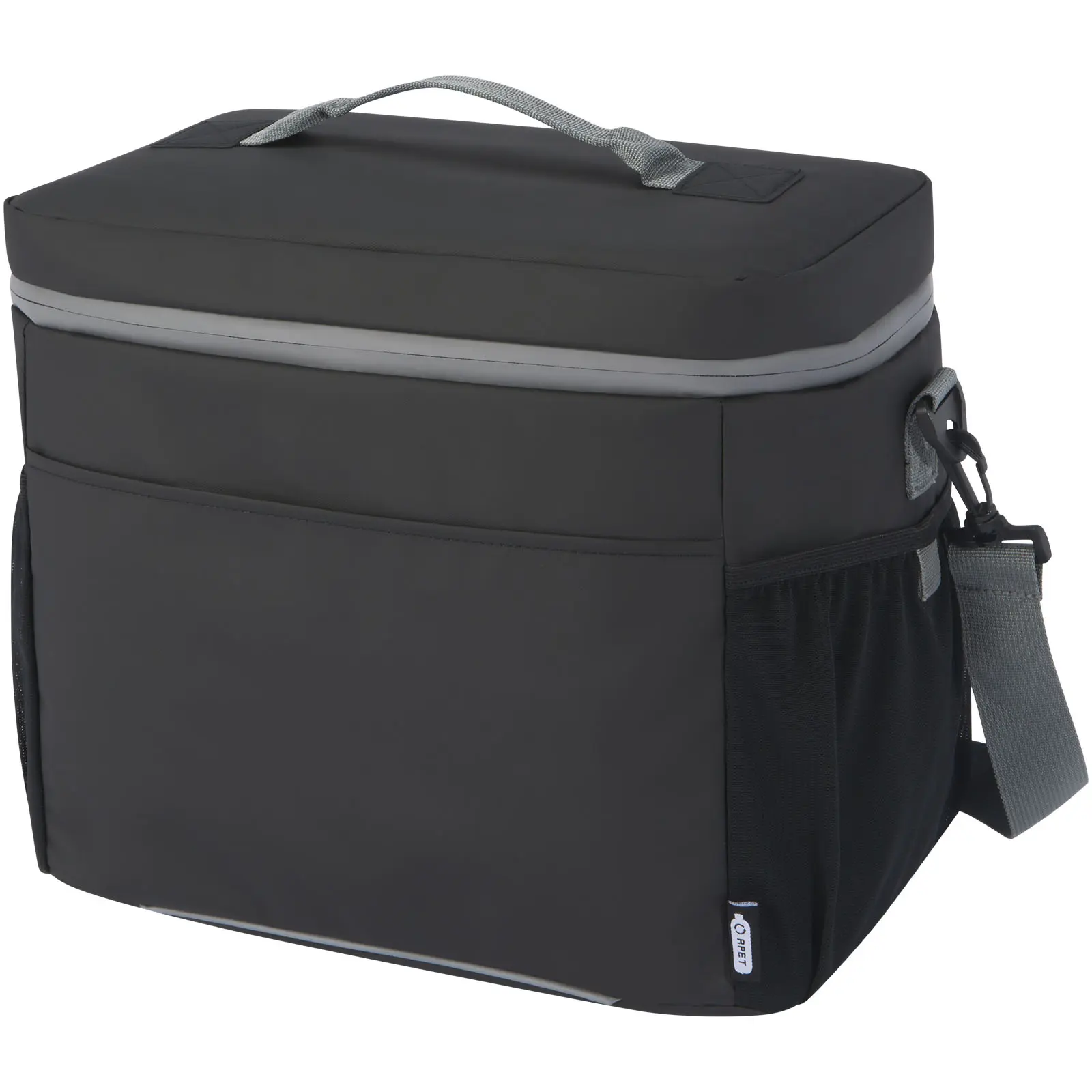 €20.03Water-resistant 20-can cooler bag made from GRS certified recycled materials, including the zips. It features a spacious zippered compartment lined with food-safe and extra thick high density thermal PEVA and foam insulation, keeping beverages and refreshments cold for hours. It also has 2 mesh pockets and one open front pocket for additional storage. The webbing carrying handle and the adjustable and padded shoulder strap makes it comfortable to carry around. The GRS recycled materials include the main fabric, lining, webbing, and zips. Capacity: 22 litres. PVC free.