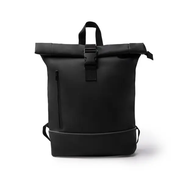 Backpack made from PU and 210D RPET with an extendable main compartment featuring a zip closure and buckle. Inside, it features a padded compartment for laptops up to 15" and a zip pocket for smaller items. Additionally, it includes an external side pocket with a water-repellent zip, ideal for carrying small items, and reflective tape on the lower part. With a padded back and handles and reinforced trolley strap.