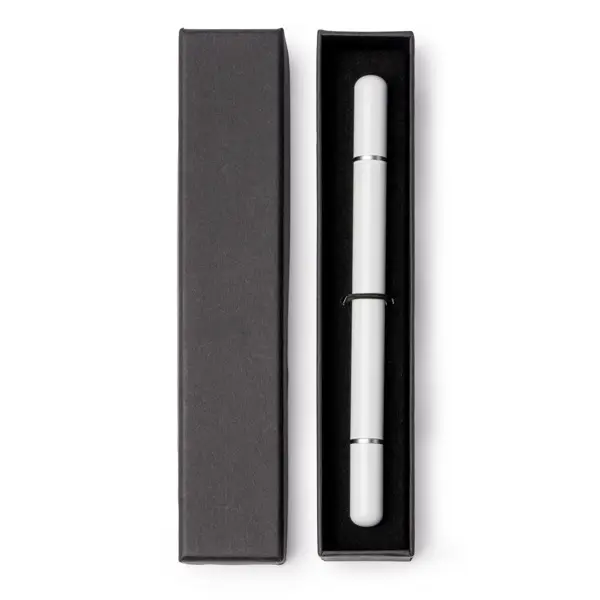 2-in-1 infinite pen and pencil with metal body. Features a pen with a jumbo blue ink refill at one end and, at the opposite end, an infinity tip pencil, both with caps. Presented individually in individual black case with padded interior.