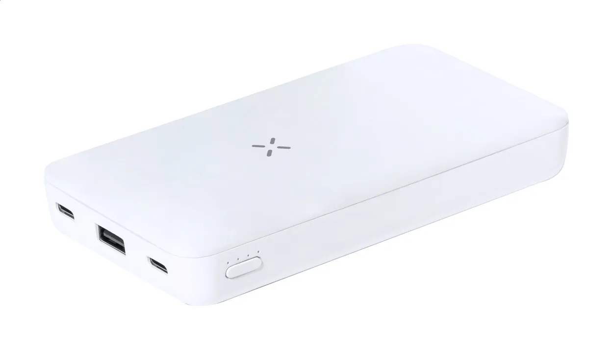 Plastični USB power bank s ugrađenim bežičnim punjačem (15W) i baterijom od 5000 mAh. S 1 USB i 2 USB-C priključka za punjenje. USB-C ulazni priključak. Uključuje USB kabel za punjenje.