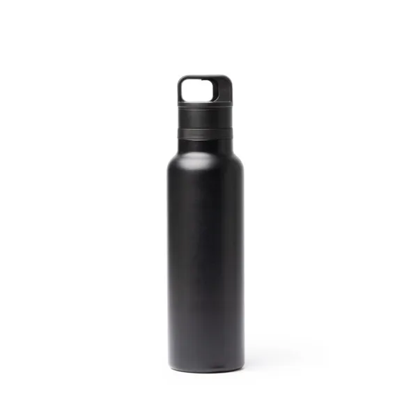Double-walled bottle made from recycled 304 stainless steel with a capacity of 750 ml. Black lid with built-in handle. Automatic opening system activated by pressing the internal button. Includes anti-drip system thanks to its inner silicone ring.
