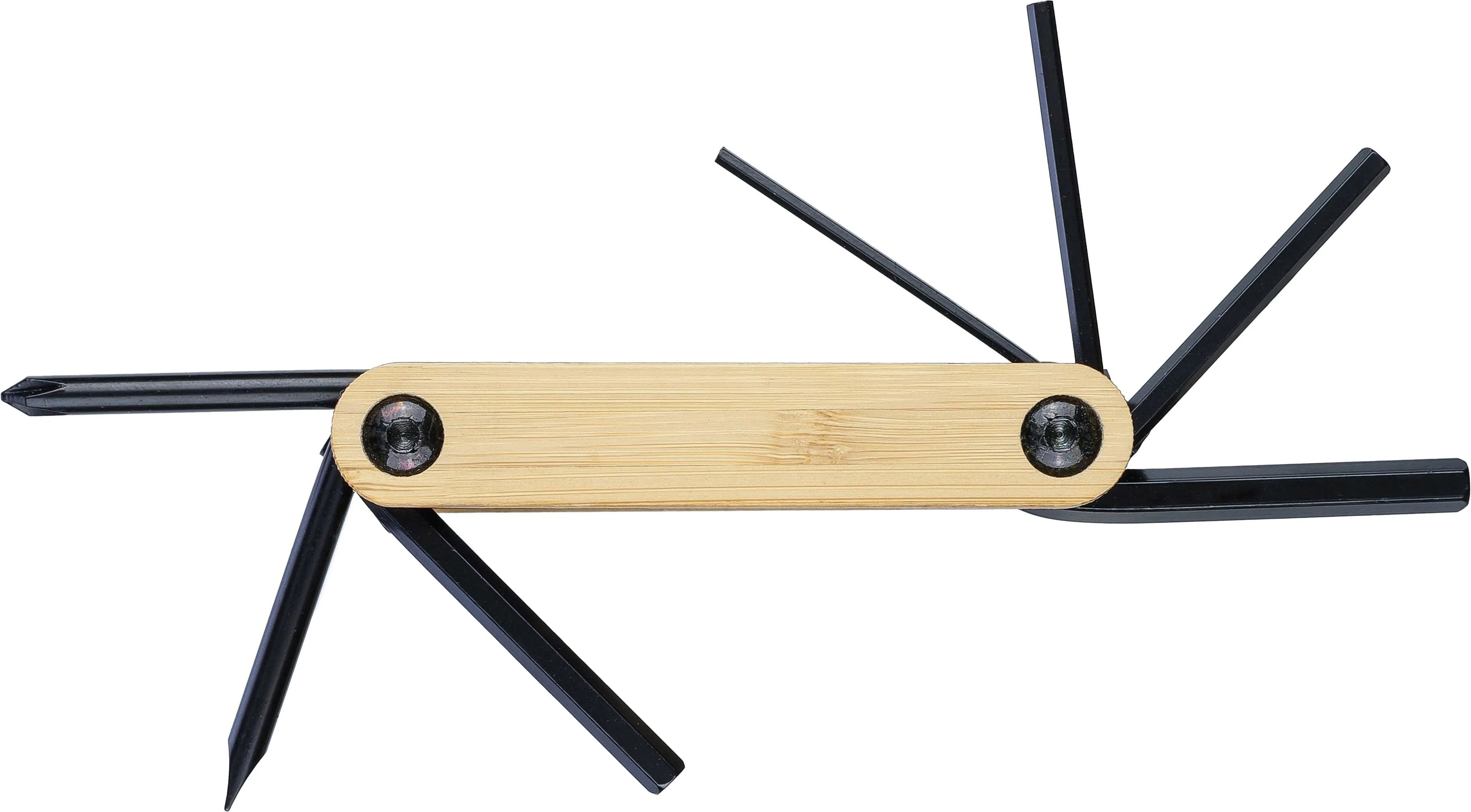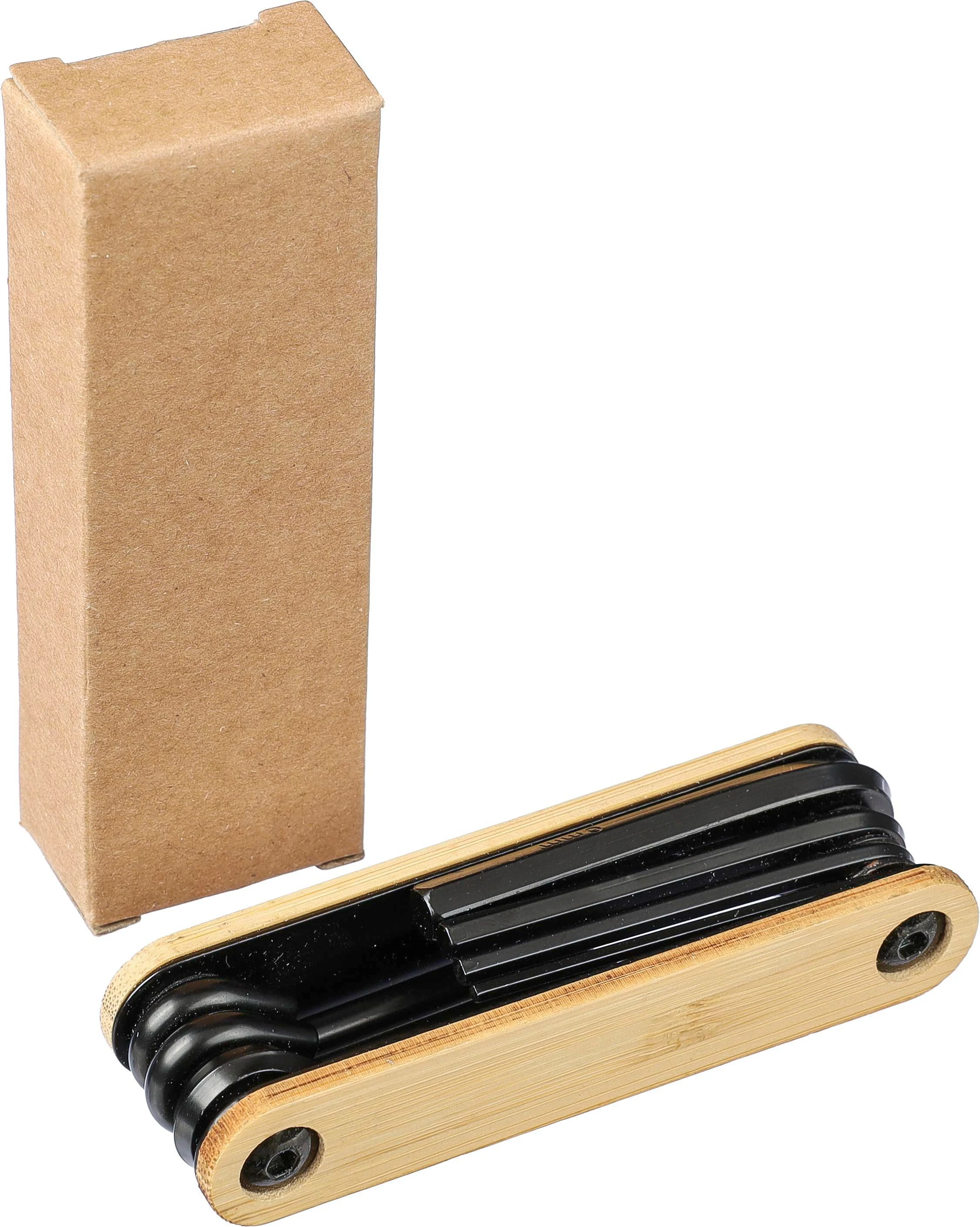 Set alata od ugljičnog čelika s bambus detaljima, sadrži 7 alata: imbus ključeve, križni odvijač i ravni odvijač, pojedinačno pakiran u smeđu kartonsku kutiju