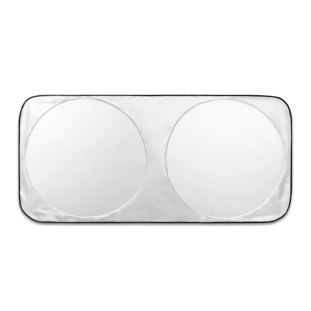 €3.98Car sun shade made of 210D polyester with two circular areas measuring 65 cm in diameter. This innovative shape is ideal for hotter days. Supplied in a 210D polyester bag, it's round for easy storage. 1500 x 700 mm