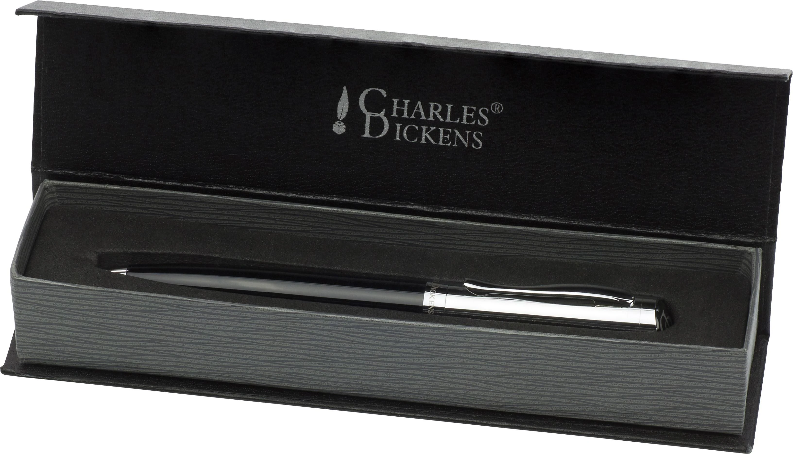 €10.17Charles Dickens® kemijska olovka s mehanizmom na okretanje i logotipom Charles Dickens® na vrhu, pakirana u luksuznoj kutiji za olovke, crna tinta