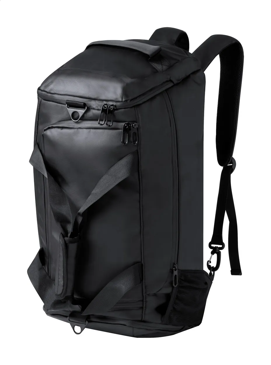 PU kožni ruksak koji se može koristiti i kao torba za nošenje u ruci ili na ramenu s pretincima na patentni zatvarač, bočnim i mrežastim džepovima, pretincem za obuću, podstavljenom stražnjom stranom i naramenicama te prednjim ručkama za nošenje