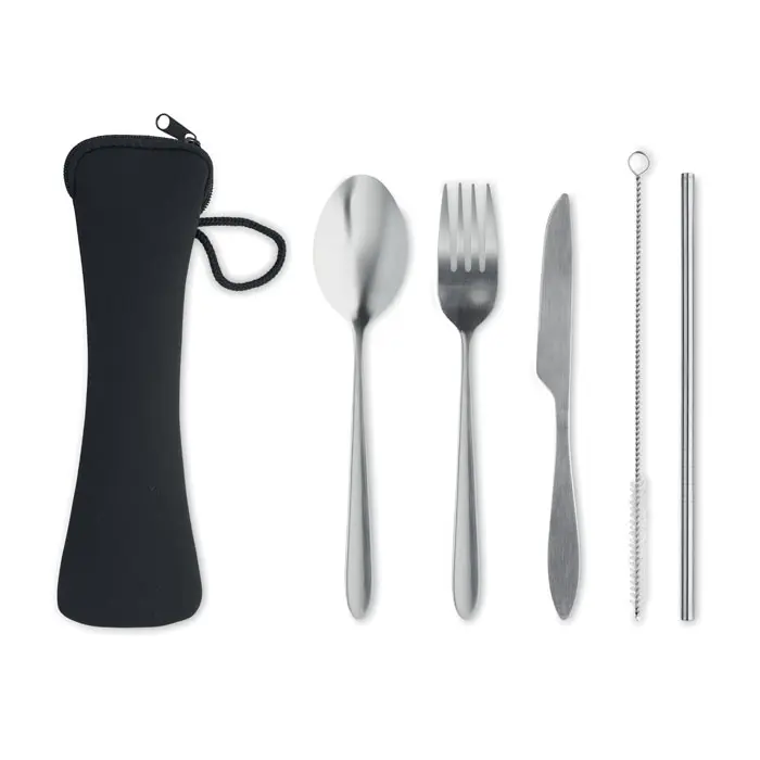 Re-usable stainless steel cutlery set including fork, knife, spoon, straw and brush in neoprene pouch.