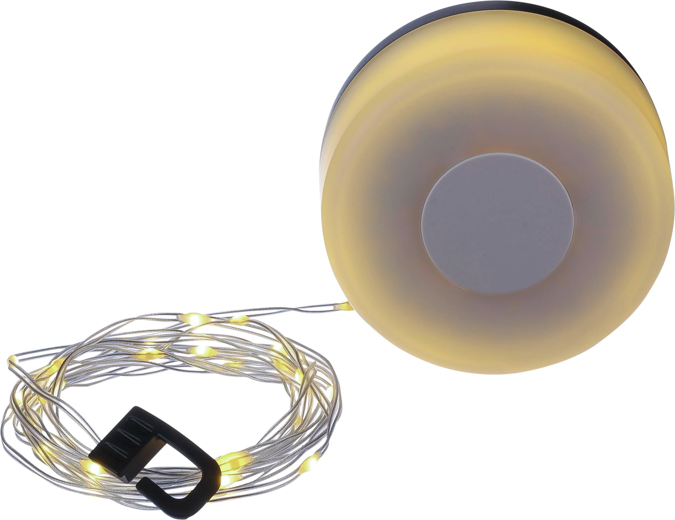€9.95ABS light with a rechargeable camping lamp featuring two light functions. Includes an 8-meter light string that can be retracted with a spool. Powered by a 1,000 mAh battery with Type-C charging. Individually packaged in a brown cardboard box.