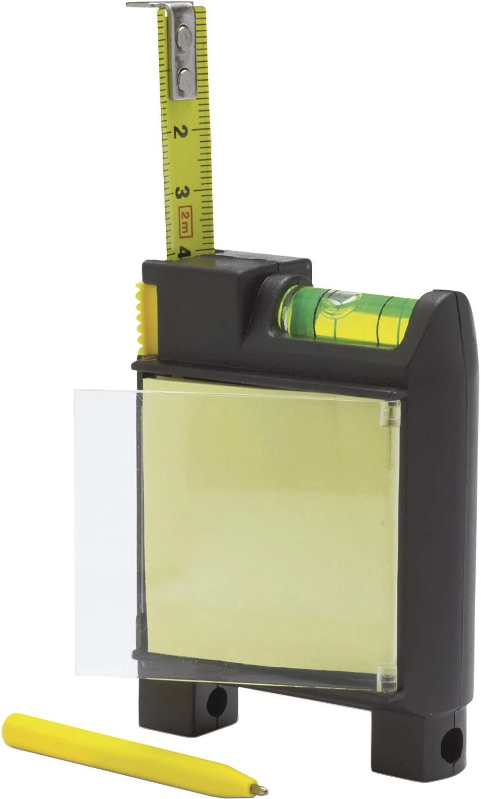 ABS tape measure (2 meter) with spirit level, memo pad, pen with blue ink, and belt clip.