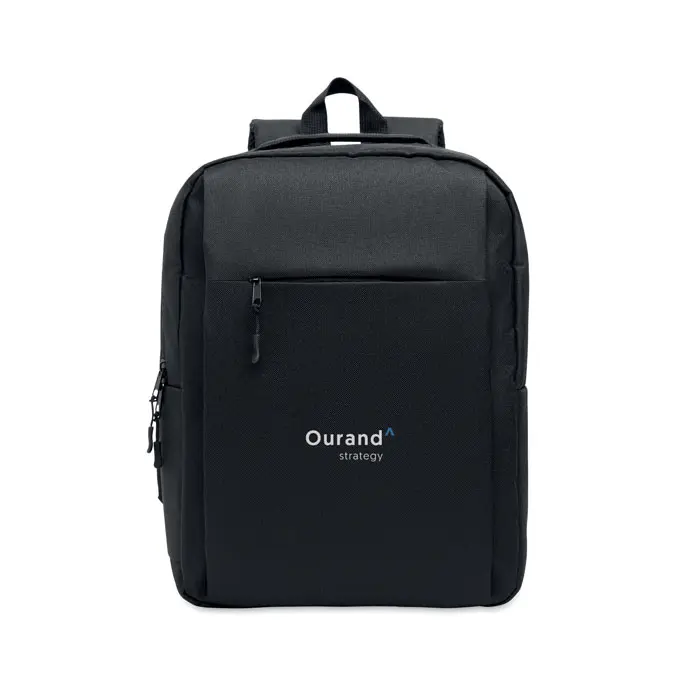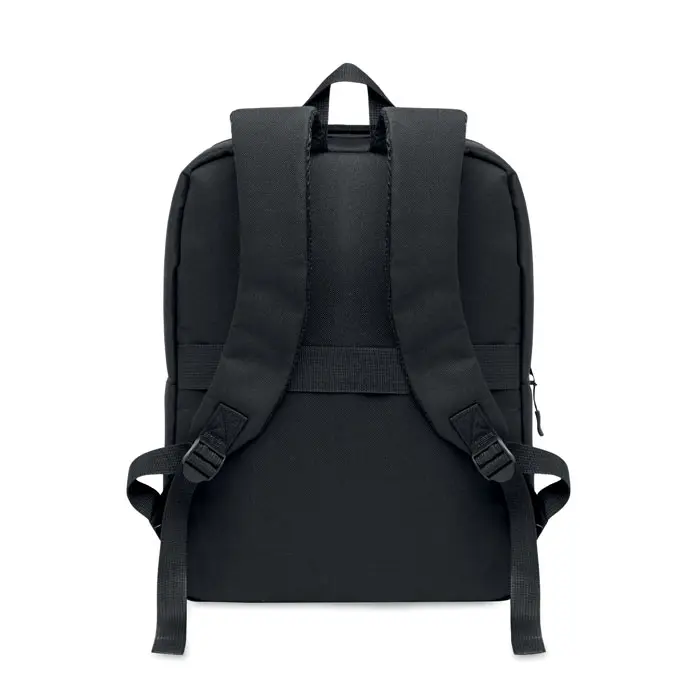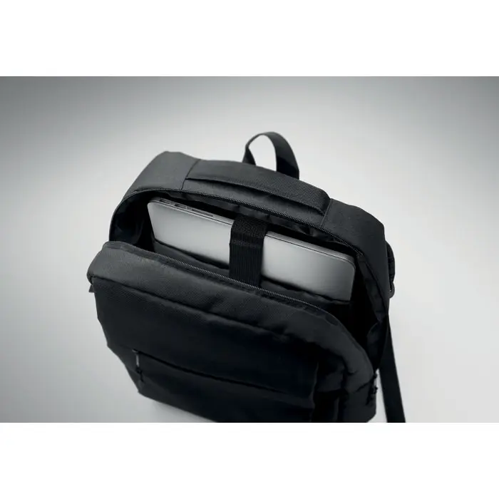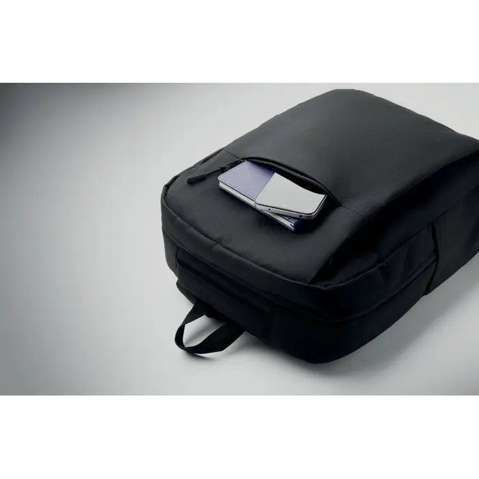€8.66Slim backpack in 600D RPET polyester and 210D lining. Has 15 inch laptop compartment, a 10 inch tablet outside zippered pocket, 2 internal pockets, 2 internal pen pockets, zippered front pocket. 2 side pockets. Soft padded back and shoulder straps. Suitcase sleeve.