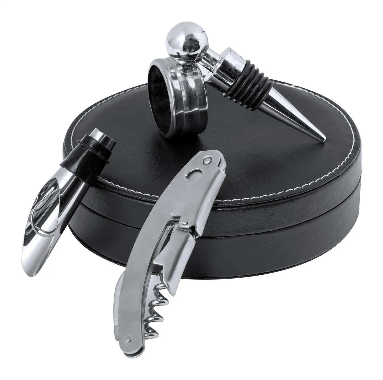 4 pc stainless steel wine set in elegant PU leather box. Including corkscrew, drop stopper, nozzle and plug.