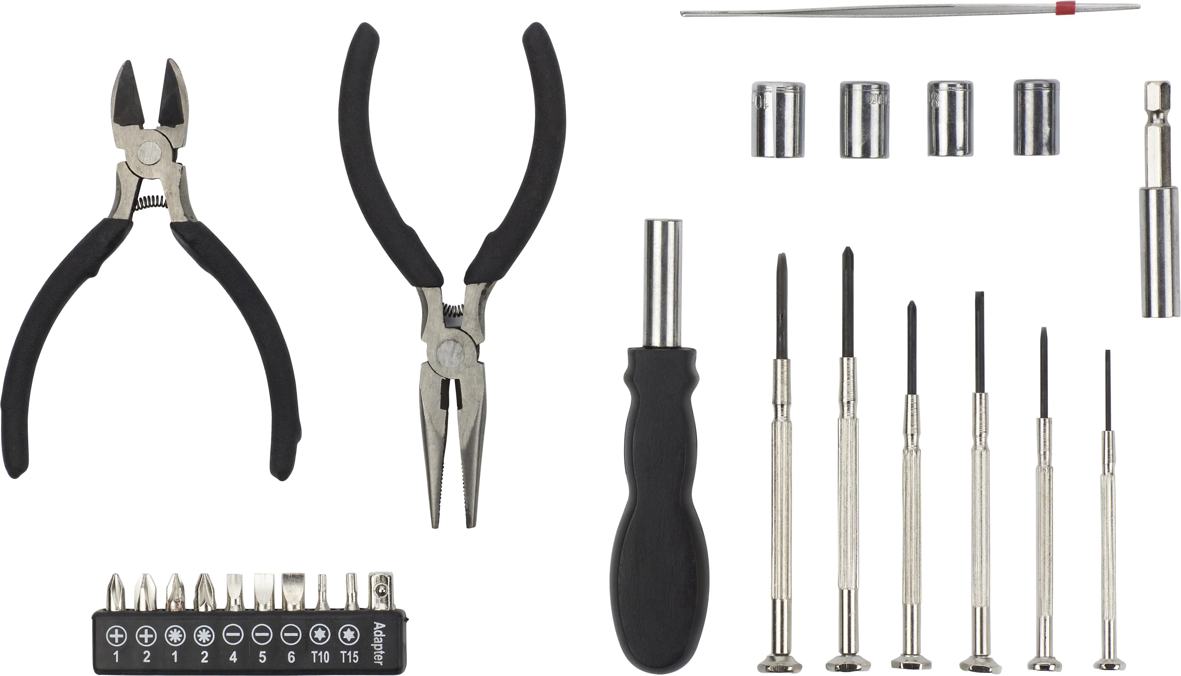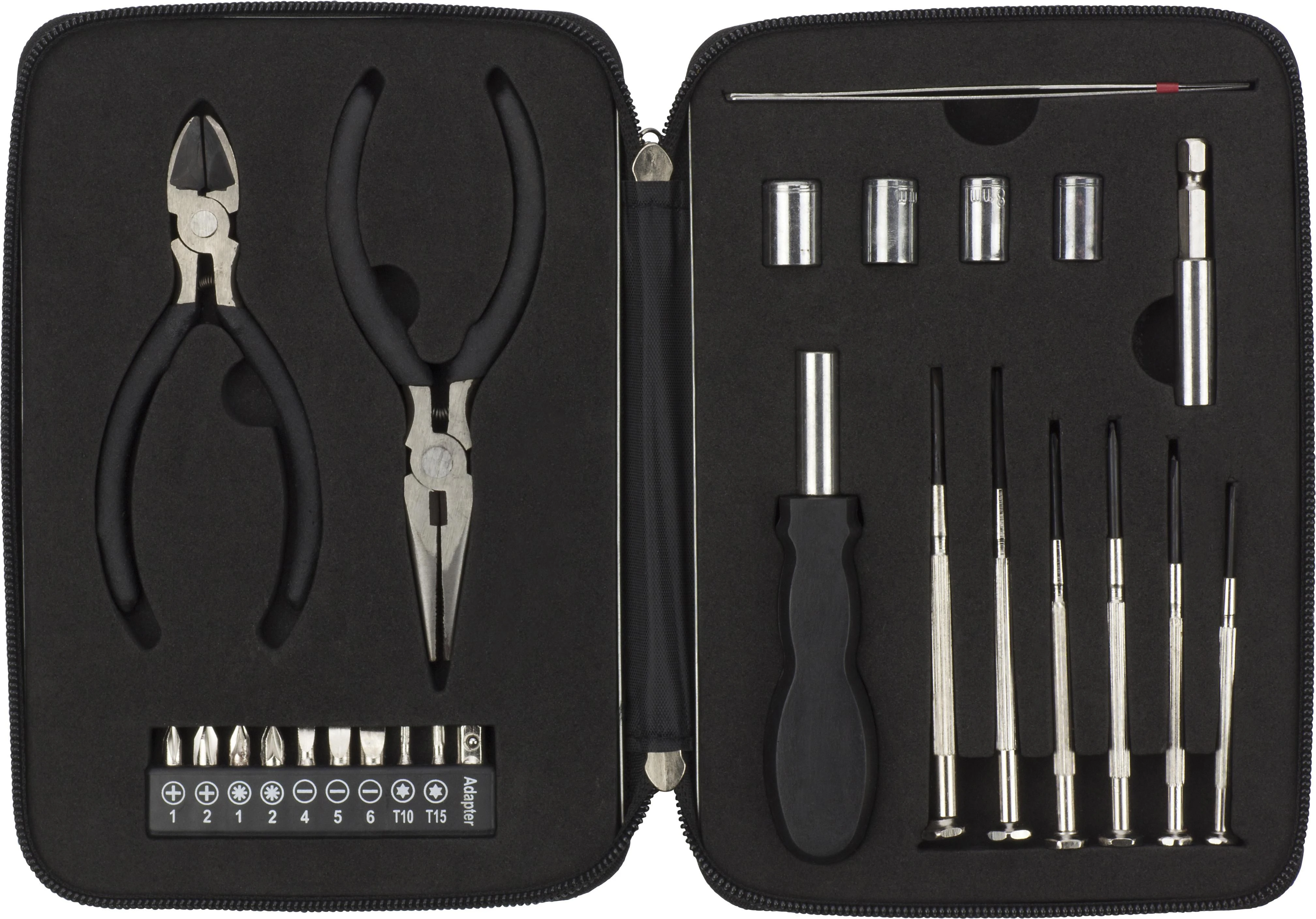 €9.8826-Piece aluminium and steel toolkit. Including: two pliers, a holder with nine different bits, an adapter, tweezers, four drive sockets, an adapter, a handle, and six different precision tools. Packaged in a metal case with zipper and EVA foam inlay.