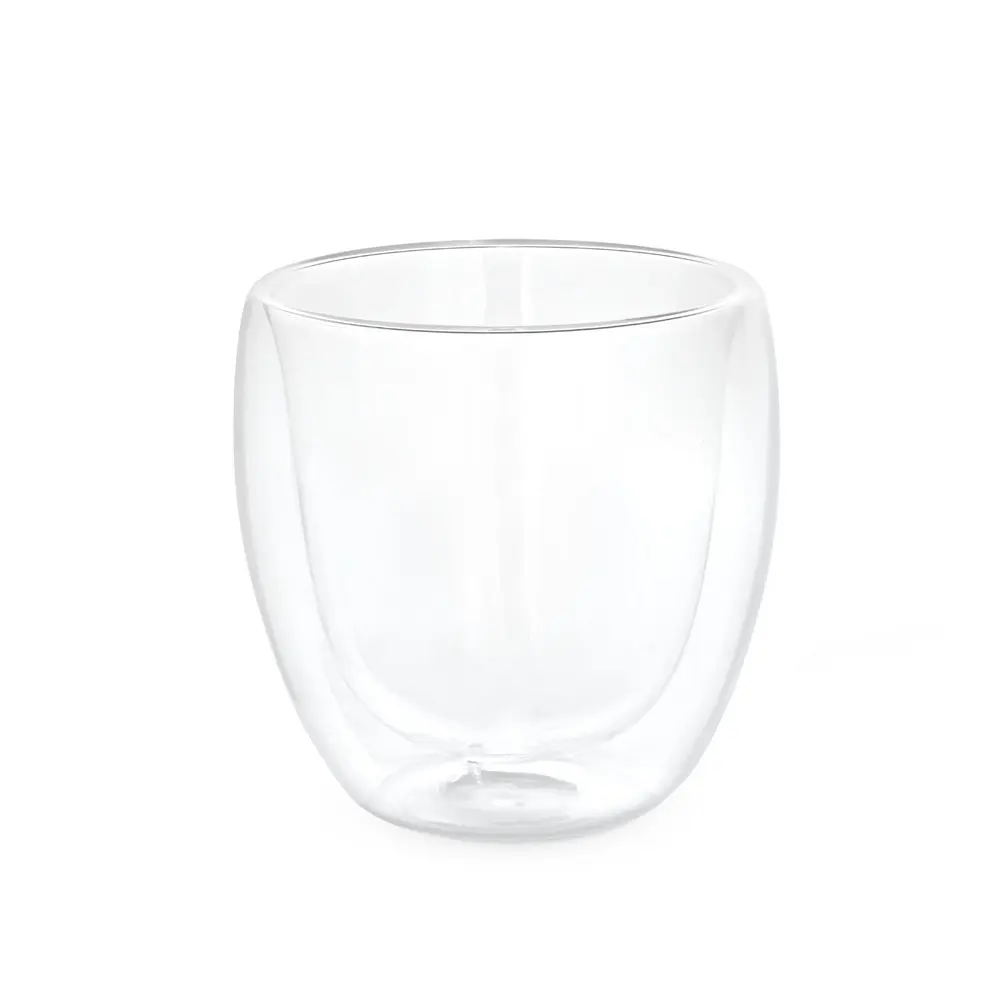 Borosilicate glass cup with air-insulated double wall and capacity up to 220 mL. Supplied in a customisable gift box. ø80 x 86 mm