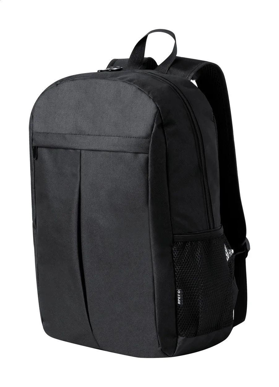 RPET backpack with zipped compartments, padded laptop (15") and tablet (10") compartment, side mesh pockets, padded back and shoulder straps. 600D RPET polyester with distinctive RPET label.