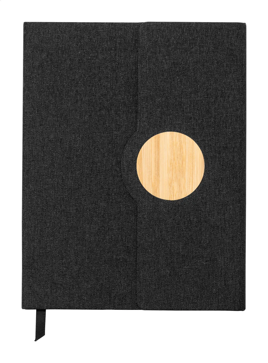 RPET polyester covered notebook with bamboo insert, bookmark, and pen holder. With 80 lined sheets. 300D RPET polyester.