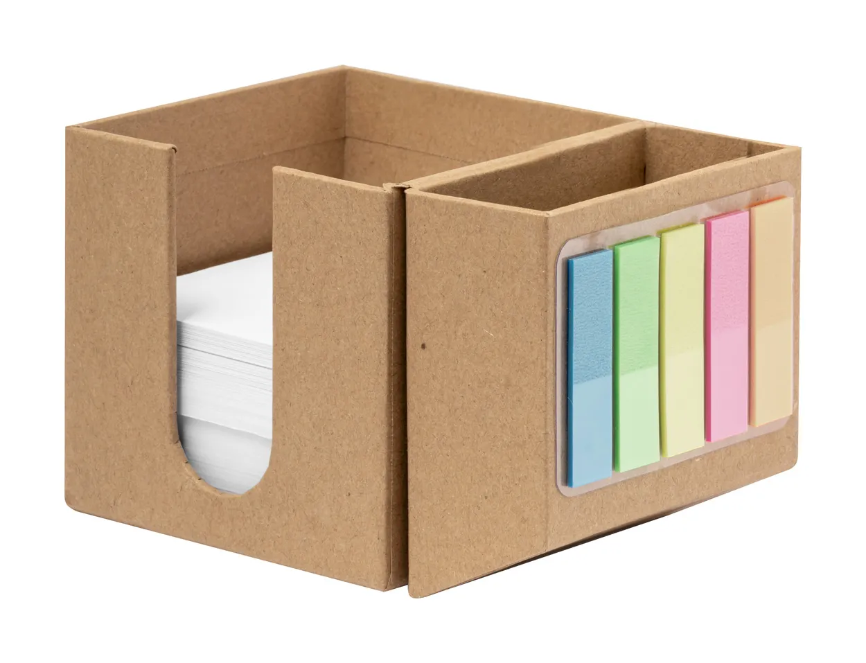 Multifunctional note dispenser with desk pen holder in recycled cardboard. Including 320 sheets paper memo block and 125 page markers in 5 colours.