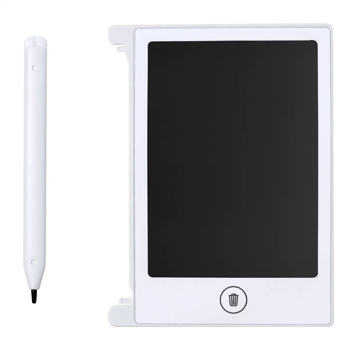 LCD writing tablet with pen holder, 4,5" screen and stylus. Including button cell batteries.