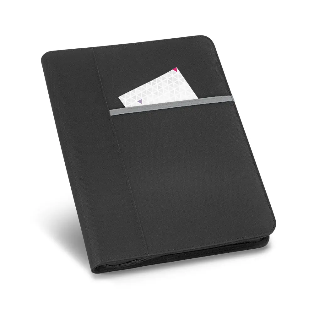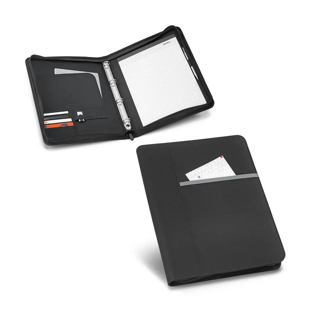 A4 folder in 600D with exterior pocket to front and zip fastening. An internal ringbinder of 4x20 mm rings enable organisation of A4 sheets. This folder also contains a pad with 40 lined pages (60 g/m²), a pen holder (pen not included) and compartments for accessories (not included). 260 x 340 x 35 mm