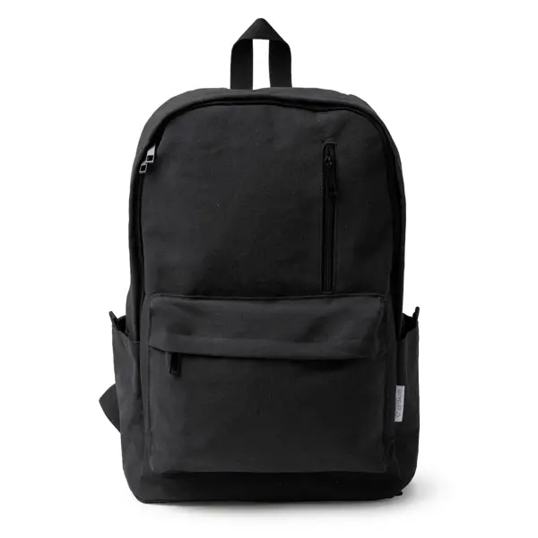 Recycled cotton backpack of 330 g/m². Large main compartment with interior pocket for 15"laptop. 2 outer pockets with zip closure and 2 side pockets. Padded handles and back. Capacity: 20L.