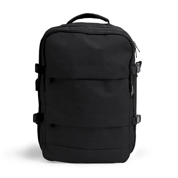 €16.93Travel backpack made of recycled RPET polyester. Padded back and handles. 2 exterior front pockets. 3 large main compartments. Main compartment with various pockets and a 17.3" padded compartment. Compartment with USB output to connect a power bank (not included). Micro USB cable included. Breathable trainers compartment. Anti-theft pocket on the back. Trolley strap. Capacity: 30 L.
