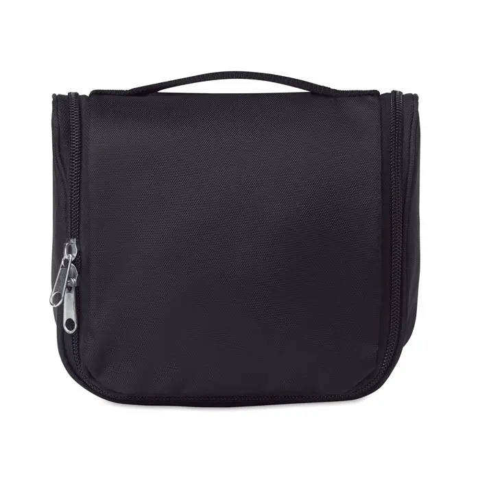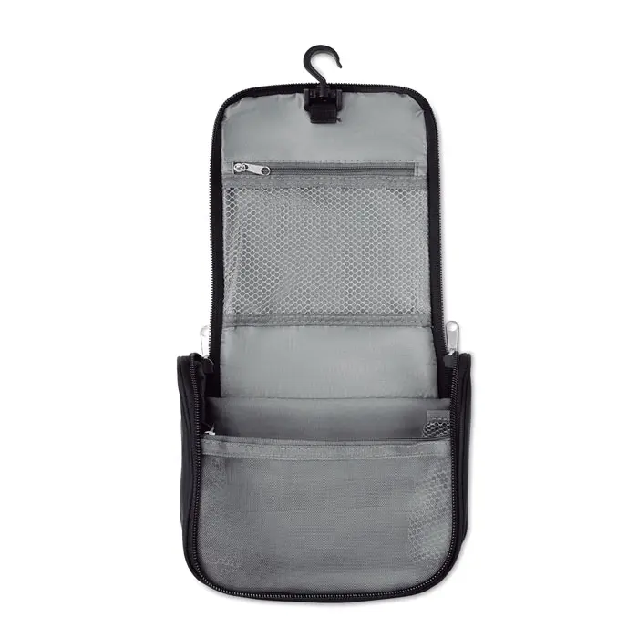 Hanging cosmetic bag with multi-compartments and mesh pockets in high density polyester. Ideal when travelling.