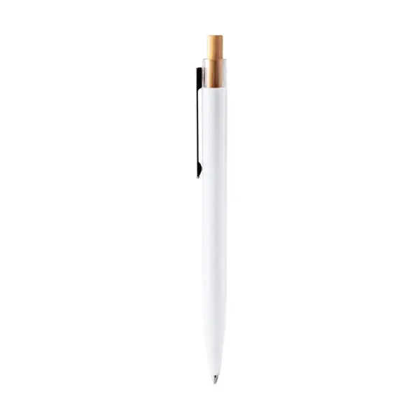 Ballpoint pen with coloured body made from recycled ABS. Features a bamboo push button, transparent details and metal clip. Blue ink.