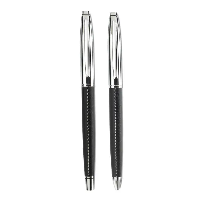 €5.05Metal pen set with ball pen and roller ball, presented in a zipped PU leather pouch in matching colour and contrasted stitching. Blue and black ink respectively.