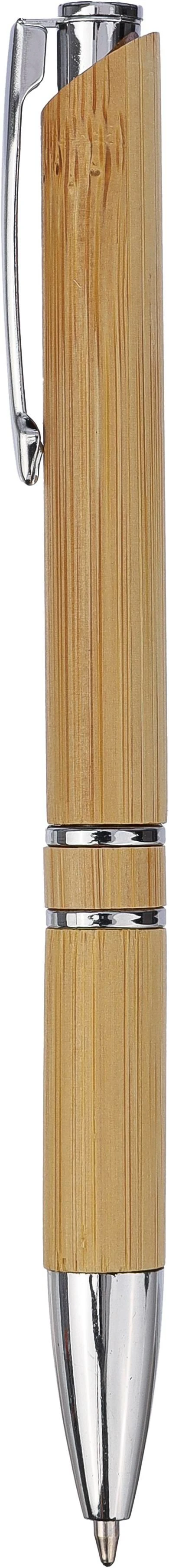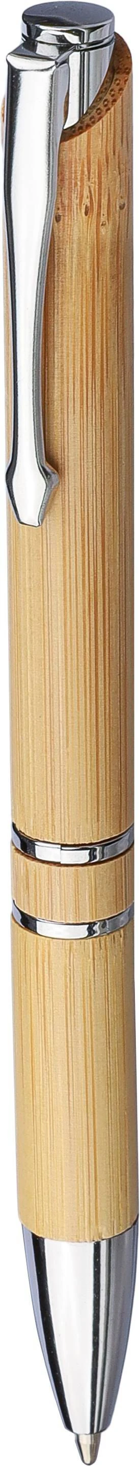 €0.42Bamboo ballpoint pen with chrome metal details and a push button. Rings, push button, and tip in plastic. Metal clip. Approx. 800 meters of writing length. Black ink.