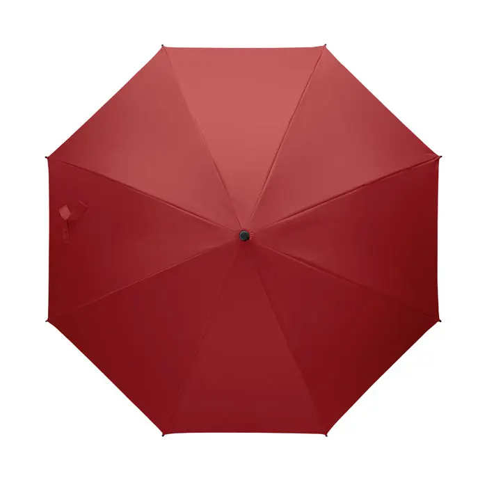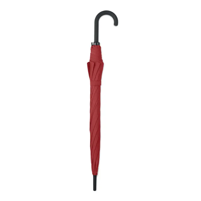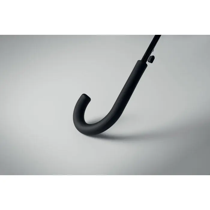 €3.9623 inch straight auto open umbrella with black plating metal frame, fibreglass ribs and panels in 190T pongee fabric. Plastic tips and top. Rubberized PP plastic curved handle. Manual closure.