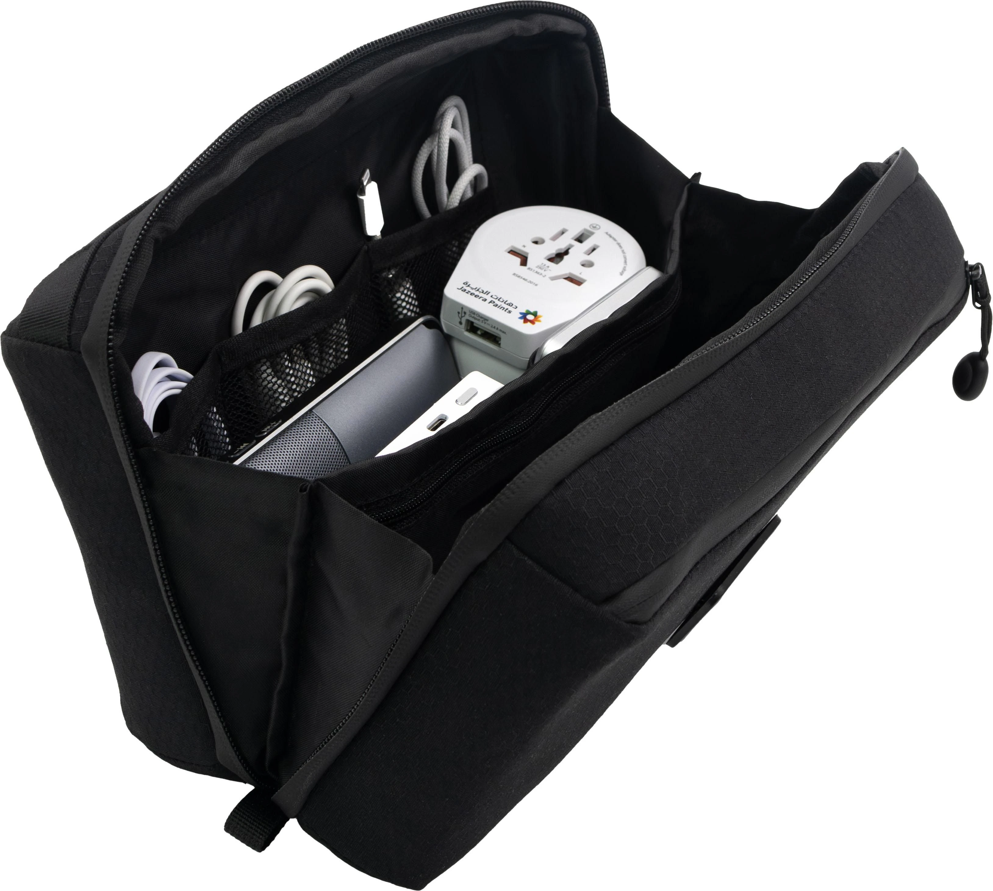 €19.43The Zen bag is a multifunctional, eco-friendly bag crafted from recycled PET bottles, ideal as a versatile corporate gift. It combines the functionality of a toiletry bag, tech organizer, and crossbody bag, with various pockets to hold personal care items or tech essentials. Standing upright on counters or hanging via a concealed metal hook, the Zen Bag adapts to any setting. Its durable semi-hard shell, weatherproof materials, waterproof zippers, and soft-touch, adjustable strap make it resilient yet comfortable for daily use. With its sleek design and multiple carrying options, Zen Bag is built for both style and durability.