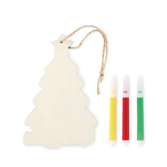 Poplar wooden Christmas tree ornament with 3 colouring markers and jute cord.