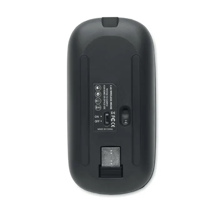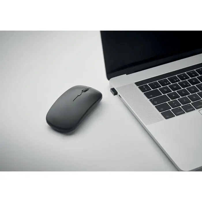 Wireless optical mouse in recycled ABS with USB rechargeable 500 mAh battery.