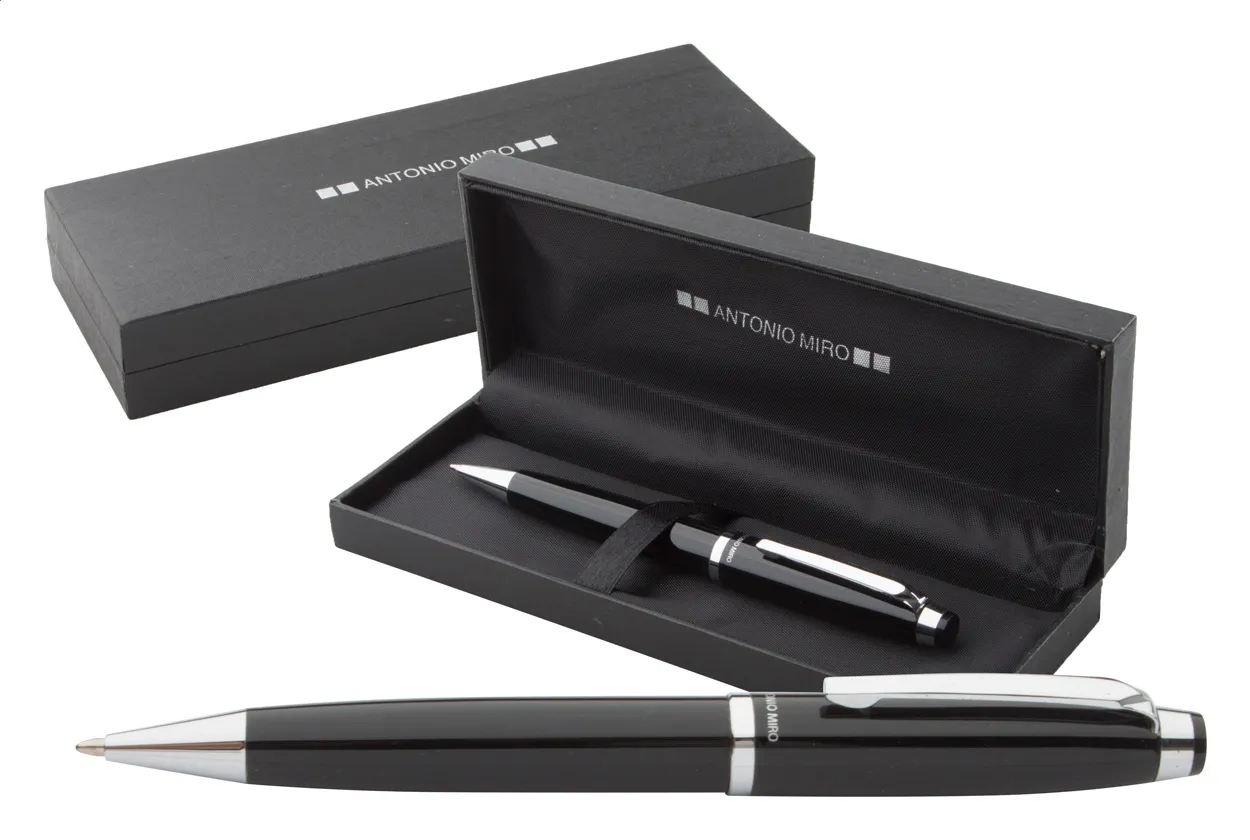 Elegant metal ballpoint pen in gift box. Antonio Miro brand product.