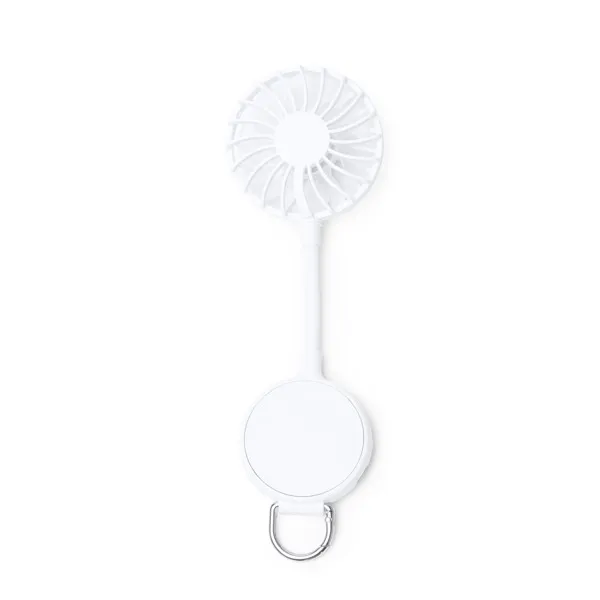 Handheld fan made from recycled ABS, with a 500 mAh rechargeable battery charged via cable. Features three speed settings and a magnetic smartphone system with magnetic ring included. Its integrated carabiner improves portability and also functions as a mobile phone stand, making it a versatile and practical option. Presentation in eco design box.