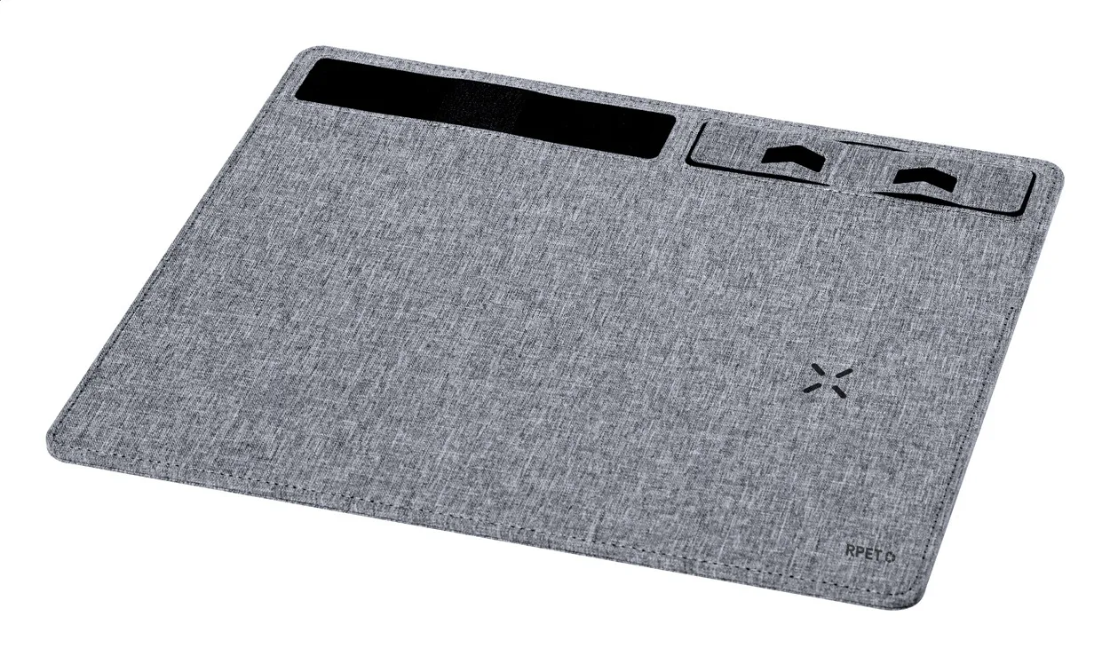 300D RPET polyester mousepad with built-in wireless fast charger (15W), mobile phone and pen holder functions. Including USB charger cable.