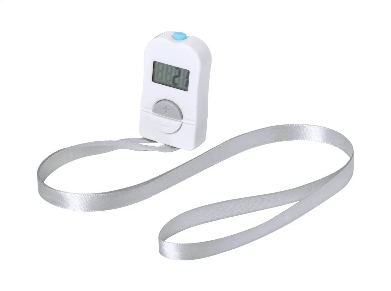 Digital tally counter in plastic housing with 4 digit LCD screen, counter and reset buttons and practical polyester lanyard. Including button cell battery.