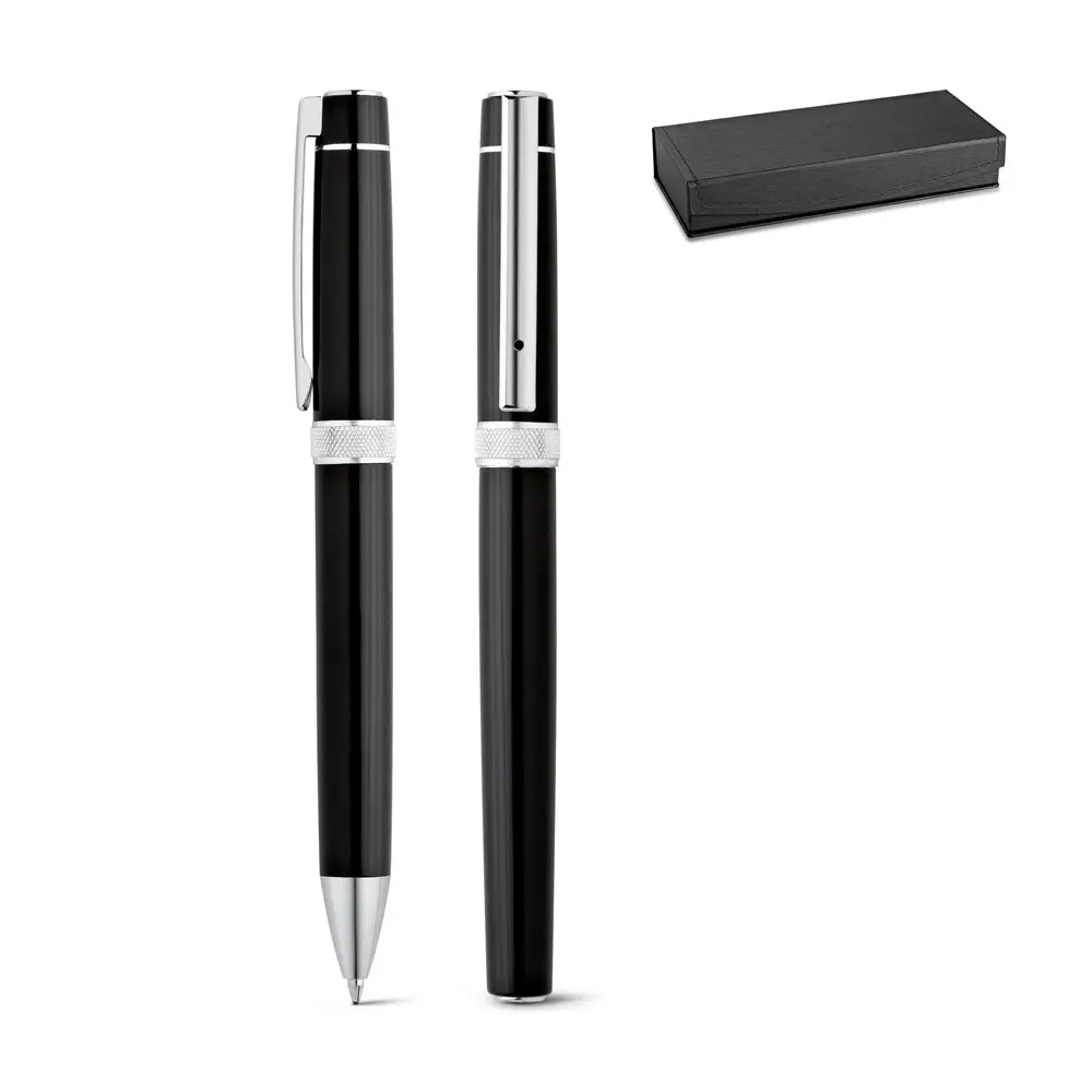 €4.98Set with rollerball and ball pen with twist mechanism, both in metal and with a clip. Supplied in a cushioned gift box. Black ink. Ball pen: ø13 x 132 mm | Roller: ø13 x 135 mm | Case: 171 x 71 x 31 mm