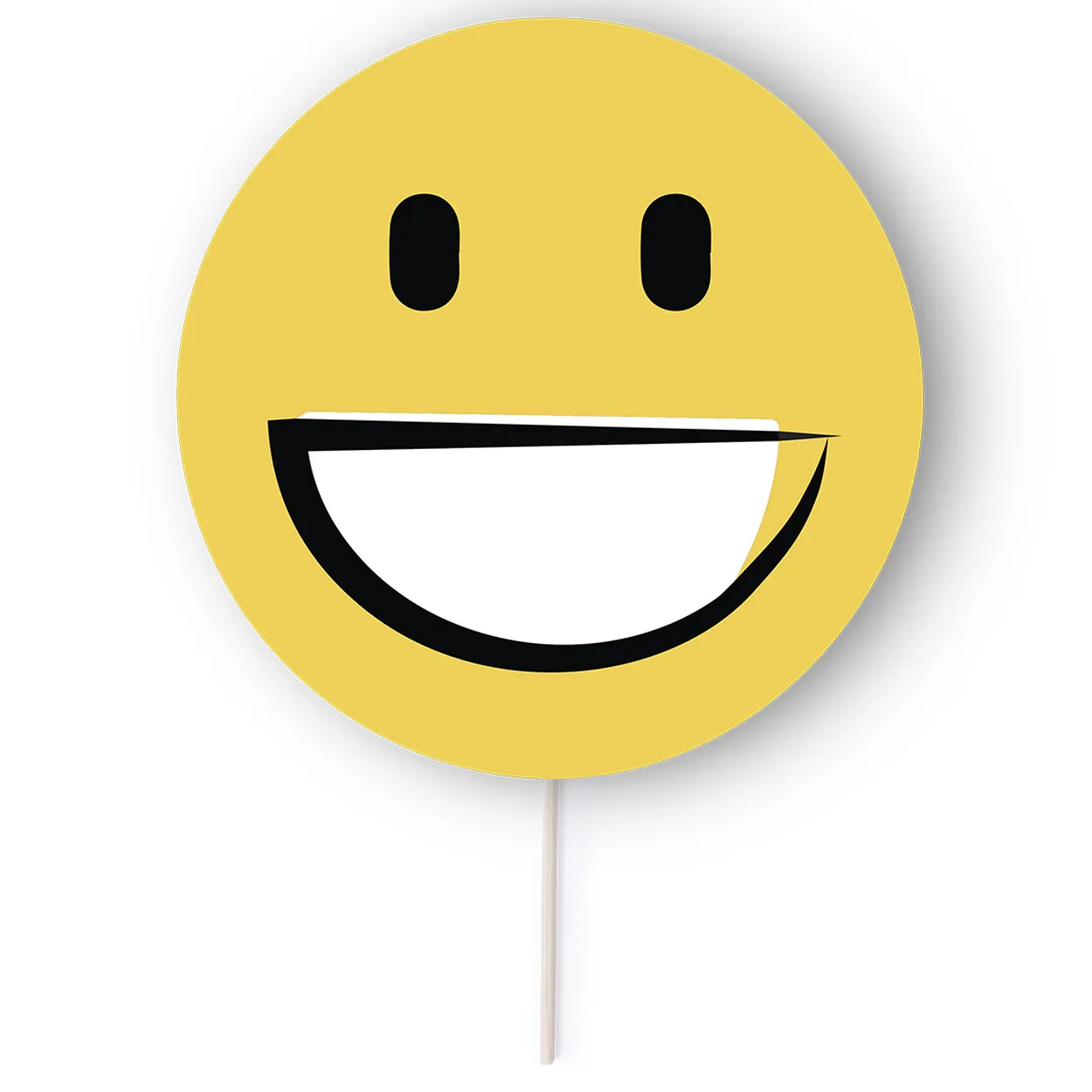 Paper fan with emoticon design and wooden handle.
