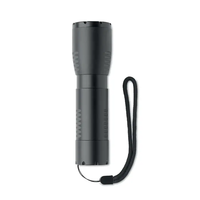 Small aluminium zoomable LED flashlight torch and detachable strap. Output: 200 lumen. 3 AA battery excluded.