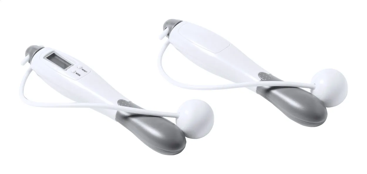 ABS plastic digital skipping rope with ergonomic grip handles and LCD screen. In RPET polyester pouch, with distinctive RPET label. Including button cell battery.