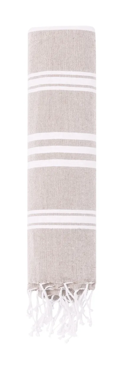Two-tone pareo beach towel in recycled cotton (130 g/m²) and polyester (125 g/m²).