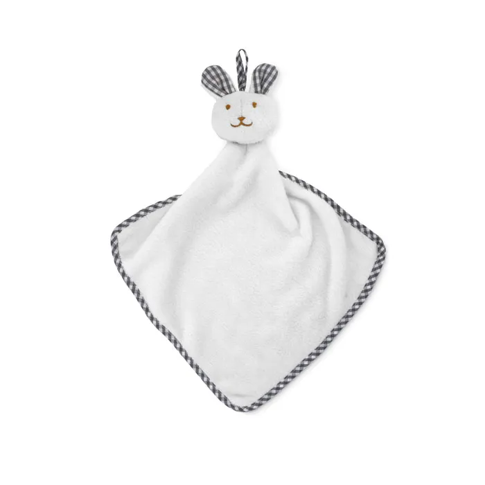 Plush baby towel in velvet polyester with rabbit design on the top. 180gr/m².