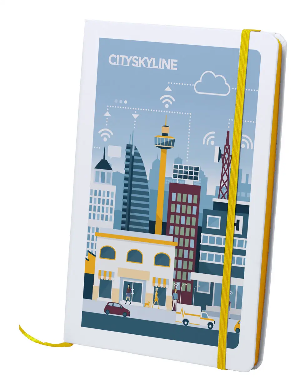 Paper covered notebook with 100 blank sheets and coloured rubber strap and matching colour side, A5.