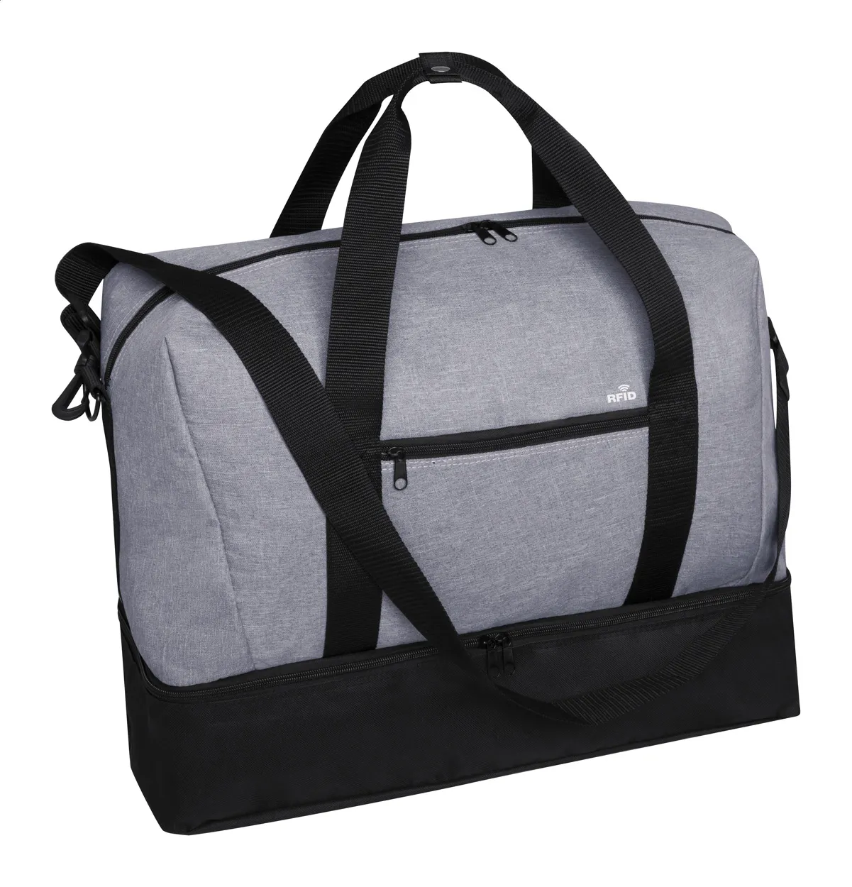 Sports bag with RFID protected pocket, shoe compartment and adjustable shoulder strap. 600D polyester.