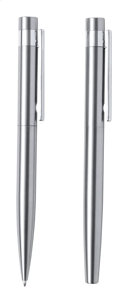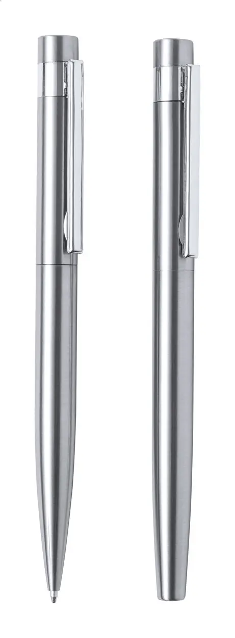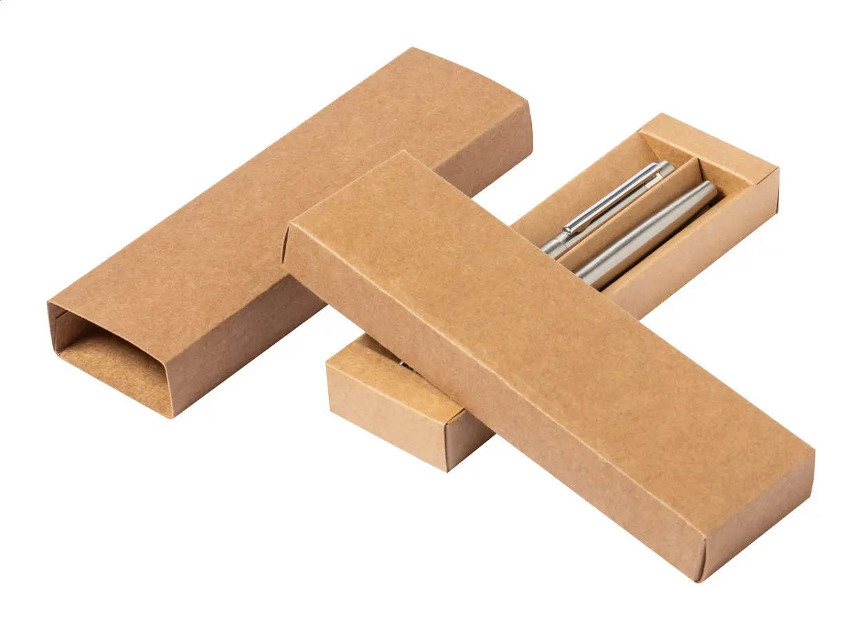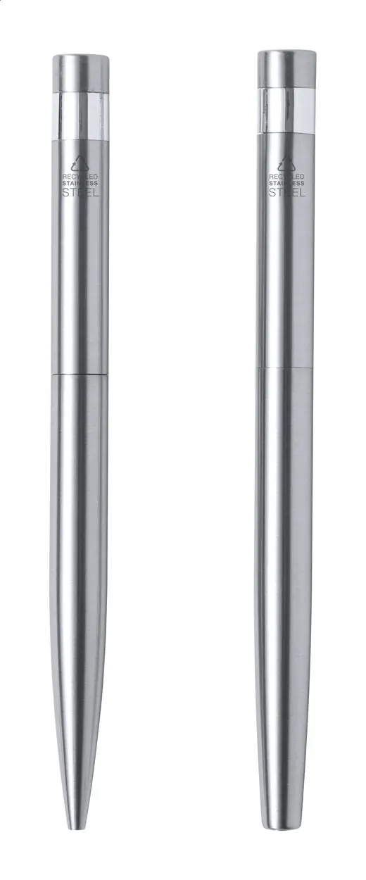 Recycled stainless steel pen set with ballpoint and roller pen. With blue refill. In kraft paper box.