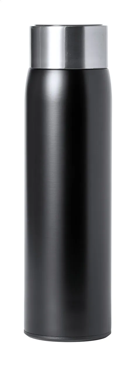 Double wall stainless steel, insulated vacuum flask with tea infuser and LED touch thermometer on the lid. 500 ml. With button cell battery. Not suitable for carbonated drinks.