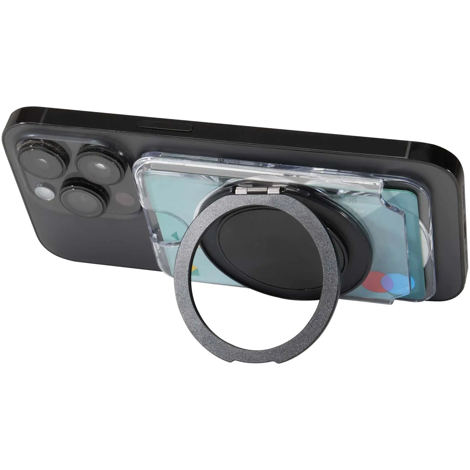 A practical gift set featuring an A6 notebook and MagSafe wallet. The notebook has a dark grey recycled plastic cover, 80 lined cream-coloured sheets of 70 g/m² paper, and a black elastic closure. The transparent MagSafe wallet holds one card and attaches magnetically to iPhone 12 or newer models, and also comes with an extra metal ring for use with other phones. Both items are presented in a sleek black cardboard gift box.