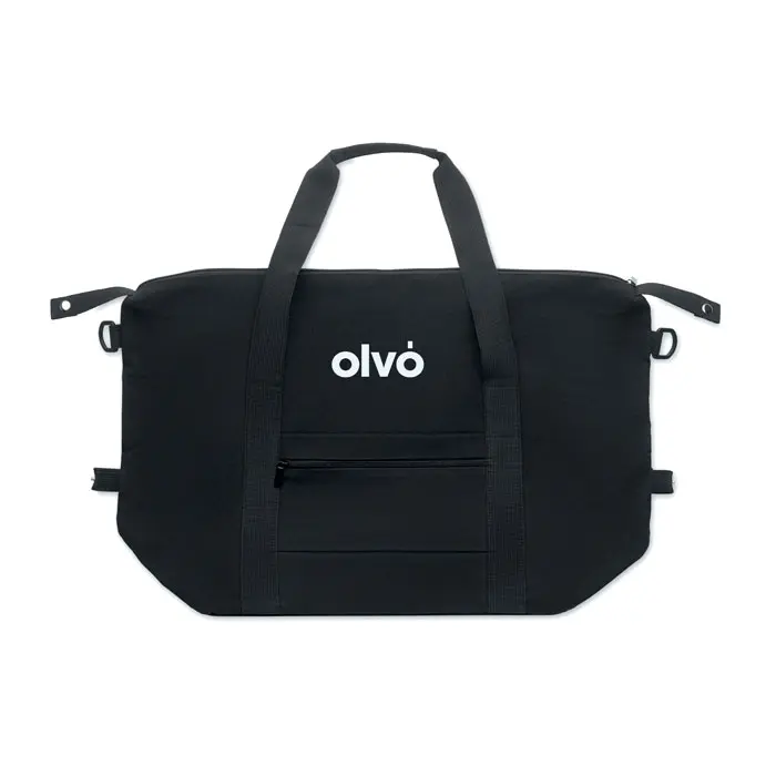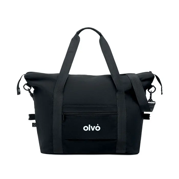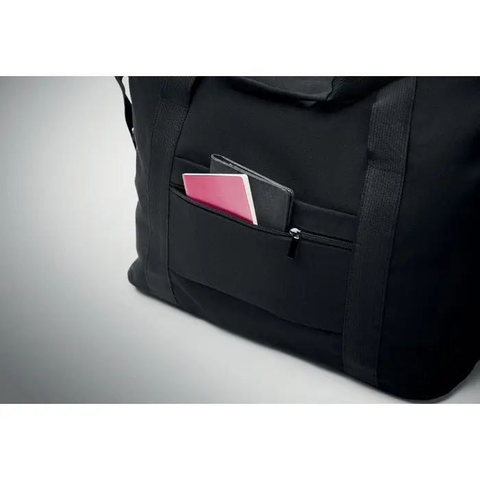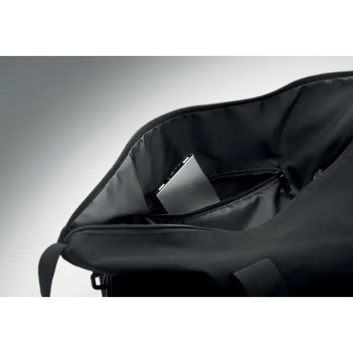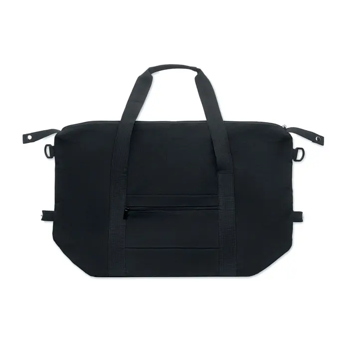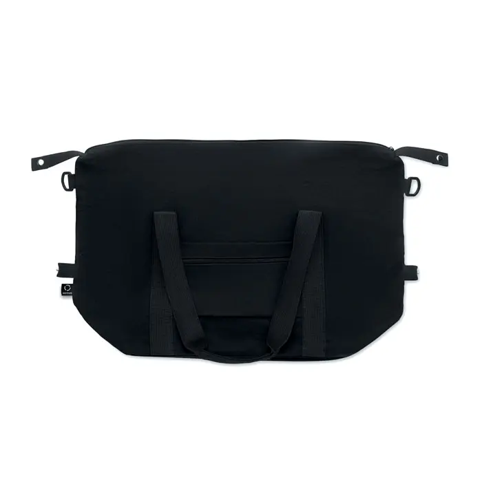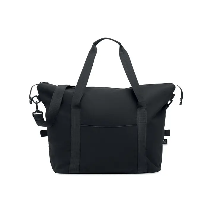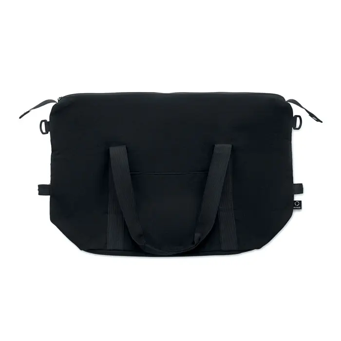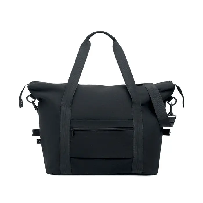 €7.99Weekend bag in recycled pre-consumer cotton and recycled polyester (70%/30%) with lining 210D RPET polyester. It has a front slip pocket, zippered back pocket a removable and adjustable shoulder strap and padded bottom. Trolley holder on reverse side.