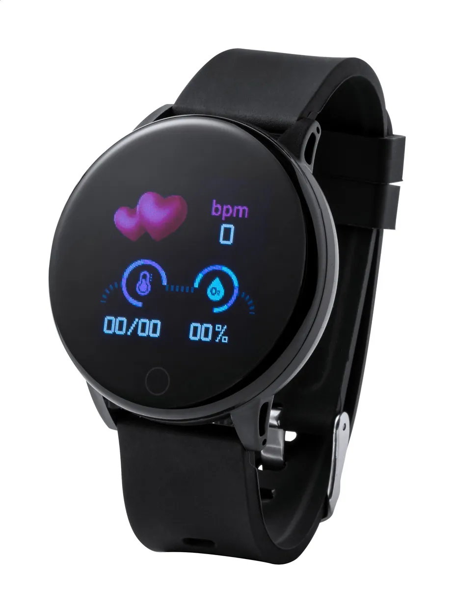 Multifunctional bluetooth smart watch with 1,3" LCD touch screen, 180 mAh rechargeable battery and TPU strap. It has several health monitoring and smart features, such as heart rate, blood pressure and oxygen monitor, bluetooth calls, weather forecast, and sleep monitor besides many others. Can be connected to smartphones with a free app available for iOS and Android. Including USB charger cable.