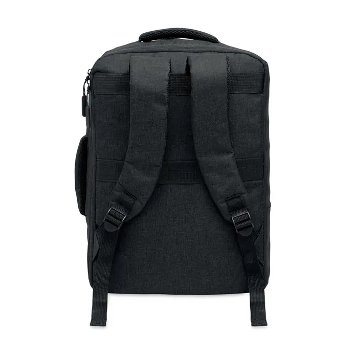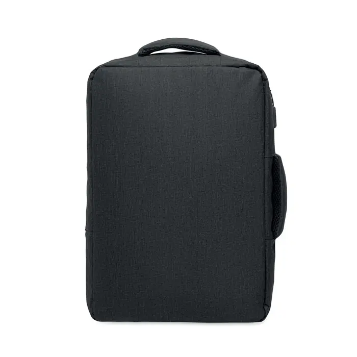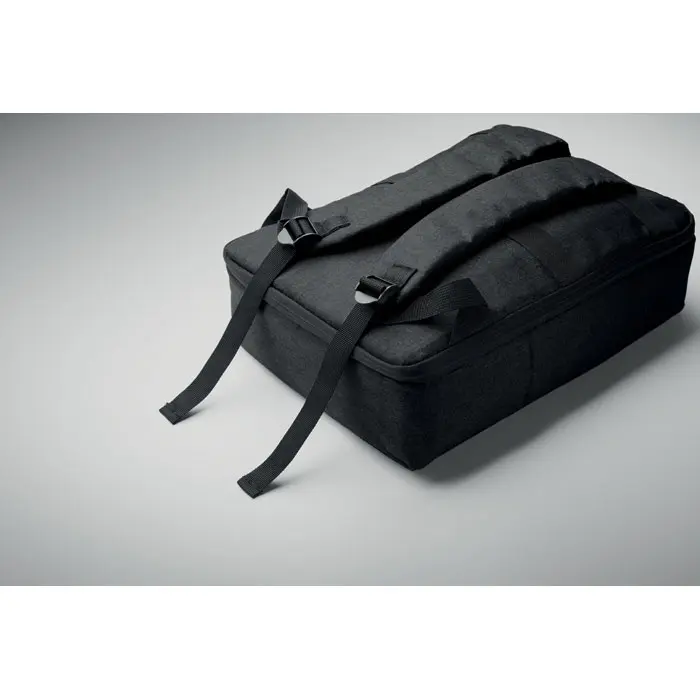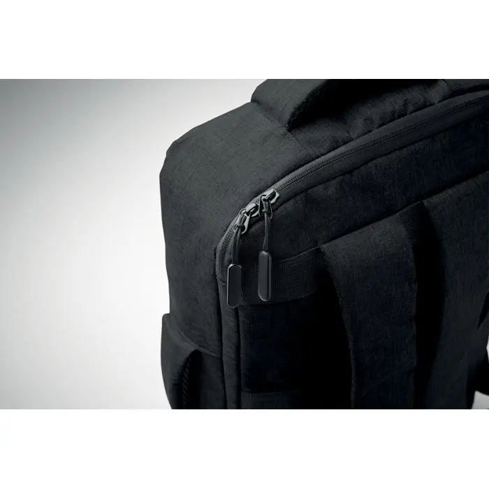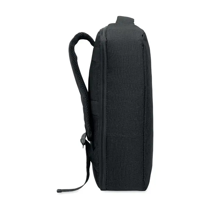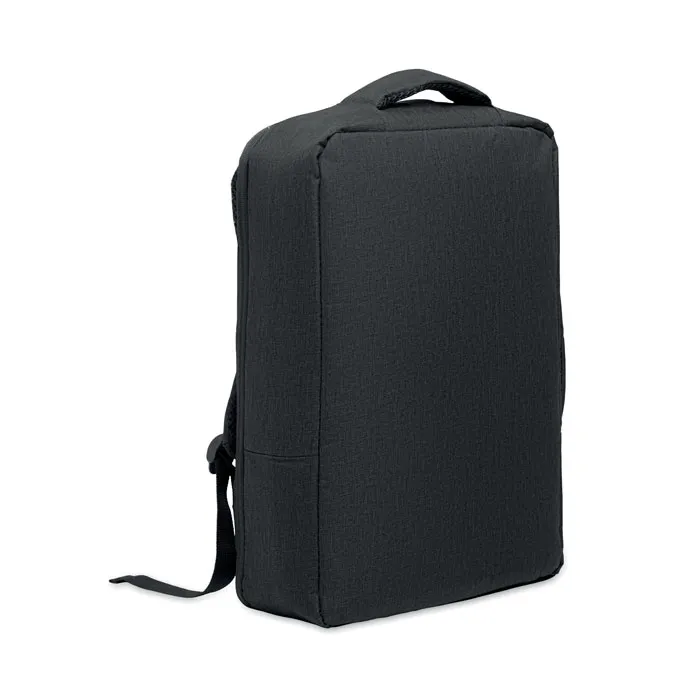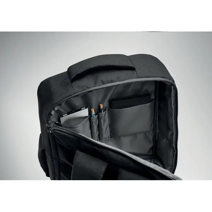 €7.07Slim 15 inch laptop backpack in 300D RPET with safe 180 degree opening with 210D RPET lining. Includes laptop compartment, 2 internal slip pockets, 2 internal pen pockets and 2 padded carry handles. Soft padded back and shoulder straps. Suitcase sleeve.